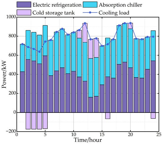 In Figure 8, the waste heat boiler serves as the primary heat source for the microgrid. It recovers thermal energy from the high-temperature exhaust gas emitted by the gas turbine, meeting the majority of the system’s heating load. The electric boiler and gas boiler adopt a time-of-use complementary operation strategy based on electricity price fluctuations. The electric boiler increases its output during low-electricity-price periods, while the gas boiler ramps up output during relatively high-electricity-price periods, thereby effectively reducing system operating costs. This time-of-use complementary operation strategy not only adheres to pricing standards, but also significantly extends the service life of the equipment. The thermal storage tanks store thermal energy during periods of low load and discharge it during peak heating demand in order to stabilize the heat supply. In the system, the waste heat boiler generates heat, part of which is used to meet the heating load, while the other part is absorbed by the absorption chiller to produce cooling. In Figure 9, the electric refrigeration reduces its output during periods of high electricity prices to maximize electricity sale revenue. The absorption chiller utilizes thermal energy to drive the refrigeration cycle, effectively providing the required cooling load for the system. The stable operation of both the electric refrigeration and the absorption chiller ensures a steady cooling supply. The cold storage tanks accumulate cooling capacity during low-load periods and discharge it during peak cooling demand to serve as an auxiliary source. This strategy helps to regulate the load and mitigates the operational burden on the refrigeration system under high-load conditions.