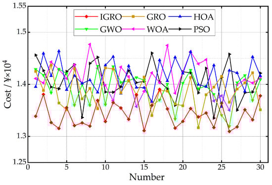 From the algorithm comparison curve shown in Figure 10, it can be seen that the IGRO algorithm achieves the optimal scheduling scheme with the lowest economic cost, and the fluctuation of its curve is significantly smaller than that for the other algorithms in solving the problem of optimal microgrid scheduling. Base on analysis of the data in Table 6, the average cost value obtained with the IGRO algorithm is 3.29%, 5.18%, 3.60%, 4.95%, and 4.52% lower than that obtained with GRO, HOA, GWO, WOA, and PSO, respectively, and the standard deviation is 23.79%, 19.83%, 24.94%, 26.76% and 30.76% lower than that for other algorithms. At the same time, the optimal cost value obtained with the IGRO algorithm is better than the optimal value obtained with the other algorithms. As can be seen from Table 7, the IGRO algorithm demonstrates a shorter convergence time compared to the GRO algorithm, indicating a clear advantage in optimization efficiency. The above data show that the IGRO algorithm shows good stability and accurate optimization ability in solving the microgrid optimization problem.