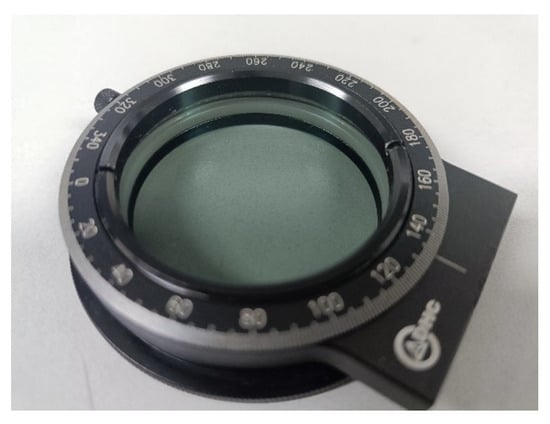 (2) Polarizer: Through early-stage comparative experiments on low-light polarization images across various bands, it was found that a polarizer film with high transmittance in the 400–1000 nm range yields the best low-light polarization imaging performance. Consequently, a polarizer with appropriate filtering properties was selected, as shown in Figure 2.