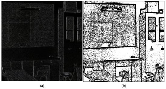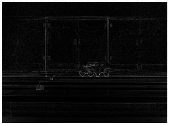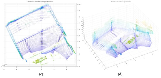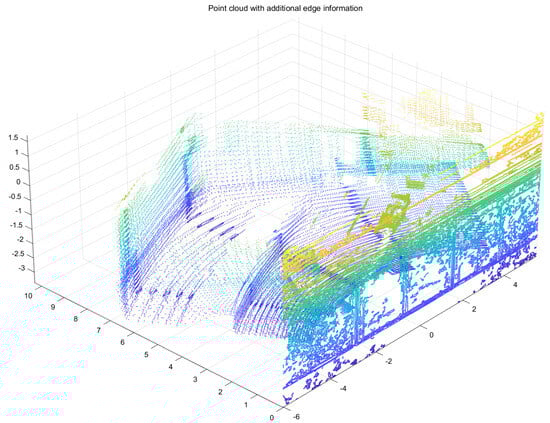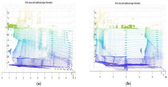 Among them, the first three dimensions are the 3D coordinates of the LiDAR point; the fourth and fifth dimensions represent the degree and angle of polarization of the corresponding pixel; the sixth dimension holds the LiDAR echo intensity; and the seventh dimension is set to one for the subsequent least squares or homogeneous transformations. Simply put, the F-matrix jointly represents “3D LiDAR points + polarization features”, thereby injecting polarization information into the existing point cloud. Using the F-matrix  and least squares method to calculate the mapping matrix in Formula (7). This mapping matrix contains depth shifts related to polarization information. By substituting  into Formula (1) and performing the inverse operation, the low-light polarization image can be converted into a 3D point cloud without laser point cloud positions. Finally, coordinate matching and fusion are performed between the LiDAR point cloud and the low-light polarization image point cloud, and Canny’s edge detection is used for correction.