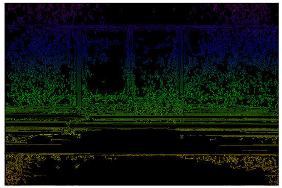 Because the micro-light polarization image is binary, the fused point cloud appears as black and white points that are difficult to interpret and lack surface texture or material cues. Therefore, the Canny operator in MATLAB is applied to extract edge details from the micro-light polarization image, and a gradient color map is assigned to the edges. Figure 10 shows the resulting color-mapped polarization image.