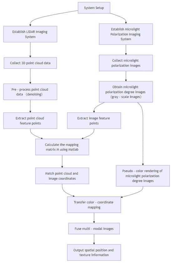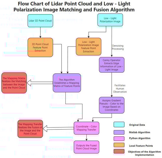The fusion effect is shown in Figure 13 by assigning different colors to the micro-light polarization image from top to bottom, so that its color has a mapping relationship with the image pixel coordinates. After the data fusion between the LiDAR point cloud data and the micro-light polarization image, the method of extracting the micro-light polarization image and LiDAR feature points to establish the coordinate matching matrix in Section 2 of this article is used to make the color information in the micro-light polarization image correspond to the corresponding point cloud in the same one-to-one way. Accordingly, it is possible to find the coordinates of the point cloud corresponding to any point of the micro-light polarization image and its spatial position information by searching for the position of any point of the micro-light polarization image and then finding the point cloud coordinates corresponding to any point of the micro-light polarization image according to its corresponding color information. Figure 14 shows a flowchart of the whole system of matching and fusion of the LiDAR and micro-light polarization image. This article requires manual migration from MATLAB2019 to Python.