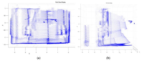 Figure 15 shows the LiDAR point cloud image with optical glass in the scene, and Figure 16 shows the optical glass scene under white light conditions. The point cloud data shows that LiDAR can scan the point cloud data in general scenes, but it cannot detect the target for the back side of the optical glass. In this regard, we can obtain the position information of the glass surface based on the LiDAR point cloud data. Then, we can take the micro-light polarization image of the same scene. After that, we can use the MATLAB2019 software program in Section 1 of this article to process the collected polarization image to obtain the micro-light polarization image. Finally, we use the matching and fusion methods in Section 2 and Section 3 of this article to fuse the LiDAR point cloud image with the micro-light polarization image, so as to obtain the laser point cloud image and micro-light polarization image under the optical glass scene. Finally, using the proposed matching and fusion method, the LiDAR point cloud image is fused with the low-light polarization image to obtain a fused stereo image of the LiDAR and low-light polarization images in optical glass scenes. From Figure 17 and Figure 18, it can be seen that in the fused radar point cloud, both the information of the cart can be displayed and the approximate positional coordinates of the cart as well as the 3D spatial layout can be determined. Of course, since the relative positions of the LiDAR and the low-light camera may change during the acquisition process, the micro-light polarization image and the 3D point cloud need to be re-matched before fusion. The grainy noise apparent in Figure 19 is dominated by sensor read-out noise. Slight mechanical vibrations during the time-division rotation of the polarizer, combined with the high AGC gain, amplify the random noise, resulting in consistent bright and dark speckles across all four polarization angle images.