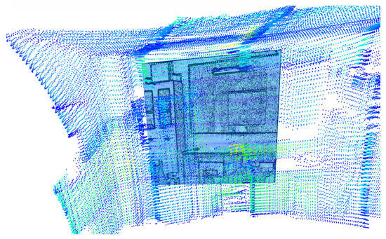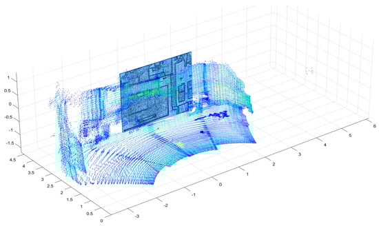 Because of the strong laser reflection by glass, LiDAR can acquire point clouds in ordinary scenes but fails to detect targets behind optical glass. Therefore, the position of the glass surface is first derived from the LiDAR point cloud. Then, micro-light polarization images of the same scene are acquired. A MATLAB program is used to process these images to generate micro-light polarization images []. The LiDAR point cloud is a three-dimensional image, while the microlight polarization image is a two-dimensional image. Thus, the matching–fusion of the LiDAR and micro-light polarization image is the matching–fusion of three-dimensional point cloud and two-dimensional image.