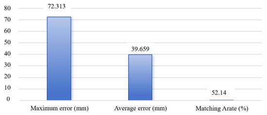 For the evaluation of the micro-light polarization image and LiDAR point cloud matching, it is necessary to consider both the matching rate and the error of the micro-light polarization image and LiDAR point cloud matching results. Due to the reflection of laser by glass, LiDAR cannot collect point cloud data behind the glass, which means that the radar point cloud is missing the data behind the glass. Micro-light polarization images are designed to compensate for the missing data in low-light environments. When filling in missing data, we are more concerned about the spatial or structural consistency between the image data being filled and the missing data in the radar point cloud. Therefore, it is better to select the “geometric consistency” evaluation metric—the matching rate—as well as the maximum and average position errors as the evaluation parameters to analyze the data quality after matching.