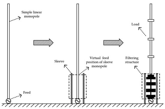 The overall design scheme of the presented monopole is illustrated in Figure 1. The initial structure is a familiar whip monopole with narrowband characteristics. To broaden its bandwidth without significantly increasing its size, a sleeve structure is introduced. The lower part of the initial monopole is converted into the inner conductor of the sleeve structure, while the outer conductor of the sleeve becomes a part of the radiator for the monopole. This modification creates a transmission line formed by the lower part of the sleeve monopole and the inner side of the sleeve. As a result, the feed point of the sleeve monopole is virtually elevated to the top of the sleeve, as illustrated in Figure 1. When the electrical length of the sleeve monopole changes from λ/4 to λ/2, the current at this virtual feed point experiences only slight variation. This behavior differs from that of the ordinary monopole, where the current magnitude at the physical feed point shifts significantly from a peak to a trough as the electrical length changes from λ/4 to λ/2. Consequently, the input impedance of the sleeve monopole remains relatively stable across a wider bandwidth, contributing to its enhanced broadband performance.