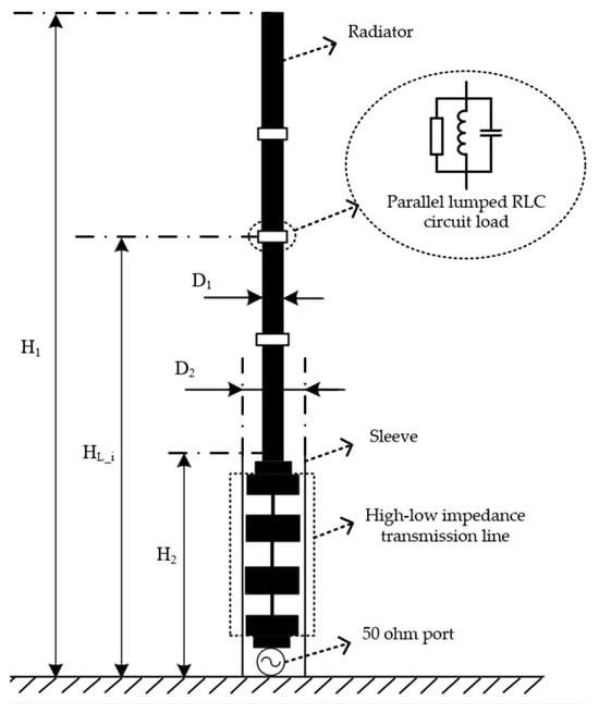 For applying in remote terrestrial wireless omnidirectional communication, a working band ranging from 200 MHz to 1500 MHz is designed. To achieve a low VSWR around 200 MHz, the total length H1 of the monopole, as shown in Figure 2, is selected to be 30 cm. The sleeve, made from a hollow cylinder with a diameter D2 = 5 cm, encloses the lower part of the radiator and has a length H2 = 10 cm. The bottom of the sleeve is grounded. To reject the widely used 2450 MHz band and the 5G communication bands in the 3000–4000 MHz range above the working band, the monopole is designed with a low-pass filtering characteristic. Inside the sleeve, a multistage structure is designed to function as a high–low impedance transmission line with the required low-pass filtering characteristics. The specifics of this high–low impedance transmission line are discussed in Section 2.2. The upper radiator, which resembles a traditional monopole, is constructed from a hollow tube with a diameter D1 = 1.5 cm. To further broaden the monopole’s bandwidth, three lumped circuits are loaded onto the radiator. These lumped circuits consist of parallel RLC elements that adjust the current distribution on the radiator, resulting in wideband omnidirectional radiation characteristics. The details of these distributed lumped loads are addressed in Section 2.3.