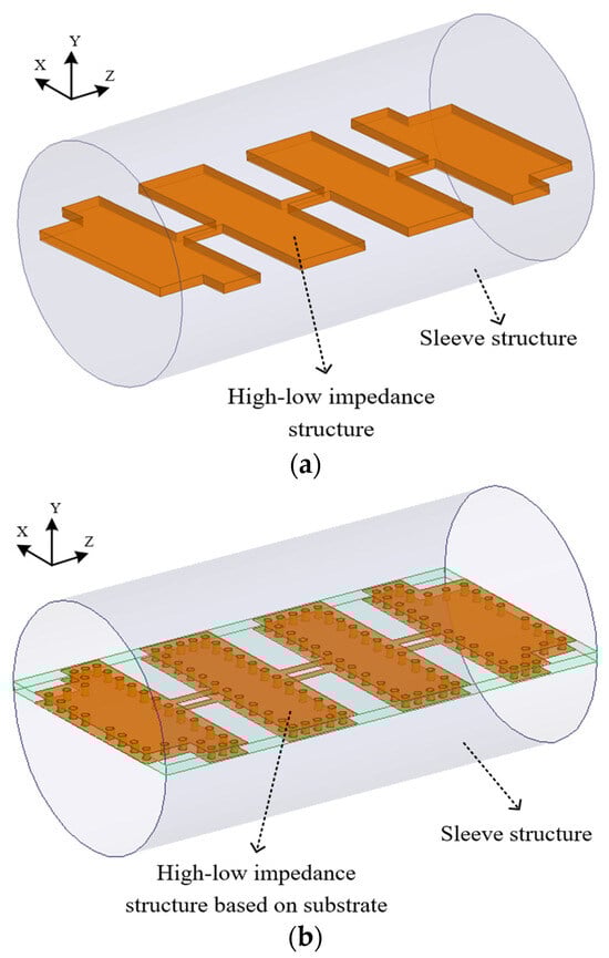 Filtering structure. (a) high–low impedance transmission line; (b) high–low impedance transmission line based on substrate.