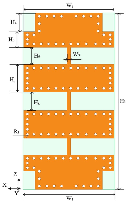 The detailed architecture of the high–low impedance transmission line, based on a substrate embedded in the sleeve, is illustrated in Figure 5. Two copper patches are etched onto a Teflon substrate with a relative permittivity of 2.1, and these patches function as the inner conductor of the high–low impedance transmission line. The patches are interconnected using multiple via holes, each with a radius of 1.5 mm, to replicate the filtering structure shown in Figure 4a. The width of the substrate W1 is 48 mm, which matches the inner diameter of the sleeve. The width of the etched low-impedance section W2 is 47 mm, slightly smaller than W1. This difference allows the substrate to support the inner conductor of the transmission line. The remaining dimensions, as depicted in Figure 5, are derived from Richards’s transformation [] and calculated based on the low-pass filtering circuit in Figure 3b. The length of each low-impedance section is optimized to compensate for parasitic capacitance effects.