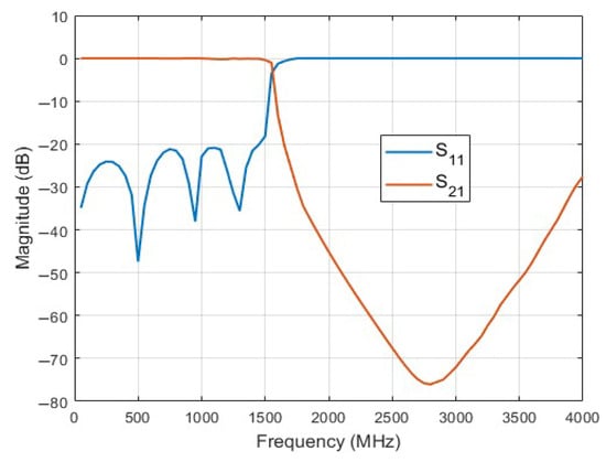 As shown in Figure 6, the optimized high–low impedance transmission line based on the substrate successfully achieves the desired low-pass characteristics, with a cutoff frequency around 1500 MHz and a stopband with S21 below −20 dB from 1700 MHz to 4000 MHz. Although the low-impedance line tends to resonate around 4000 MHz, causing a slight degradation in rejection from 3000 MHz to 4000 MHz, the rejection remains below −20 dB in this range, meeting the specified rejection requirements.