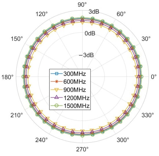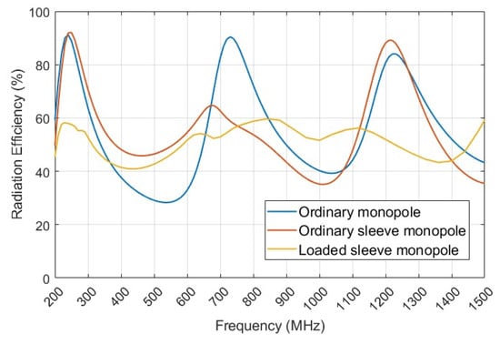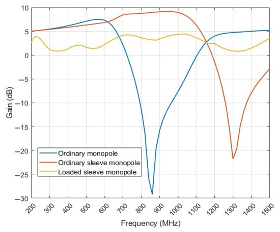 The optimized monopole demonstrates an omnidirectional gain greater than 0 dB across the relevant frequency range, as shown in Figure 7. For comparison, the gain of an ordinary monopole and that of an ordinary sleeve monopole are also plotted in the same figure. Both of these monopoles exhibit narrower bandwidths due to the occurrence of a zero gain in the omnidirectional pattern. In contrast, the presented monopole avoids this issue thanks to the proper design of its lumped loads.