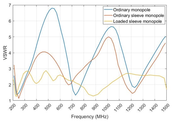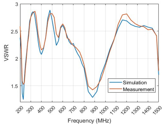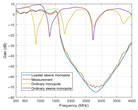 The measured and simulated VSWR of the presented monopole are compared in Figure 14. The results demonstrate that the monopole effectively covers a wide frequency range of 200–1500 MHz with a VSWR of less than 3. The agreement between the simulation and measurement is generally good, with any discrepancies likely arising from the practical fabrication of the load circuits, which may differ slightly in spatial arrangement compared to the point load used in the simulation. The measured gain and filtering characteristics of the monopole are shown in Figure 15, with satisfactory agreement between the measurement and simulation. The figure also compares the gains of an ordinary monopole and a standard sleeve monopole of the same size. The presented monopole not only offers a broader bandwidth but also demonstrates superior filtering performance, with a stopband below −20 dB from 1700 MHz to 4000 MHz.