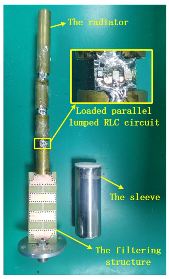 Once the filtering structure is designed, the high–low impedance structure based on the substrate is integrated into the sleeve, as shown in Figure 2. To achieve satisfactory radiation performance, three lumped loads are strategically placed on the monopole, as depicted in the same figure. Each lumped load consists of a parallel RLC circuit. The monopole is simulated using the Method of Moments (MoM) to model its electrical characteristics. The positions of the loads and the values of the components in each load are optimized to achieve the desired electrical performance. The optimized parameters of the loads are summarized in Table 1, with the load positions measured from the ground. These optimized values are practical and easily implemented in real-world designs.