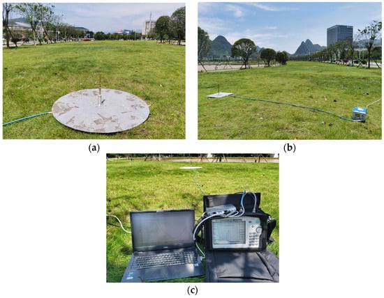 Experiment in outdoor open half-space environment. (a) the presented monopole under test; (b) transmitting terminal; (c) test data collecting and control platform.