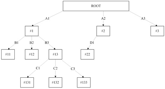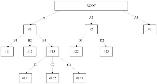 Example of an unpruned decision tree. Numbered labels (e.g., #1, #11, #13, #131) refer to nodes, while alphabetical labels (e.g., A1, B2, C3) indicate attribute splits at each branch.