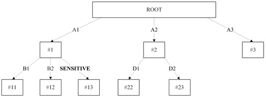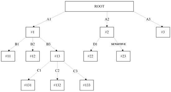 To illustrate the concepts of our proposed algorithm, let us assume that attribute value B3 is a confidential value. Following the standard bottom–up post-pruning strategy, our proposed method will compare each of the attribute values with the value of B3. If its value is equivalent to B3, we will prune the related node #13 to a leaf and modify the attribute value of B3 to “SENSITIVE”. Since node #13 consists of three children, #131, #132, and #133, all of its children will be removed as it is no longer significant in the classification process. Although node #13 is no longer useful in classification, the strength of the decision tree allows each of the nodes in the model to perform classification tasks. In this case, node #1 will handle the classification duty on behalf of node #13, as the testing instance is not able to traverse to the leaf of the decision tree. Additionally, retaining the sensitive node #13 might also give a better insight to the decision tree user. It is also worth mentioning that the removal of the class label for node #13 or even the entire node #13 can be performed without affecting the current classification ability of the entire model. Figure 2 shows the decision tree model after the sensitive pruning procedure.