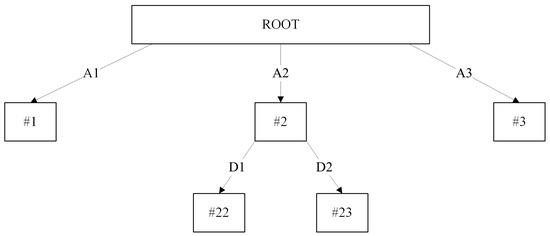 Assuming attribute value D2 is denoted as the confidential value, succeeding the sensitive pruning in Section 3.1 would result in the tree illustrated in Figure 3 and Figure 4. If the decision tree only splits based on two values, it is basically absurd to follow the sensitive pruning because a single split in the decision tree does not provide any significant benefit to the current tree. Therefore, we proposed to prune all of the descendants (subtree) of node #2 when the number of splits is equivalent to two, converting node #2 into a leaf node.