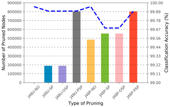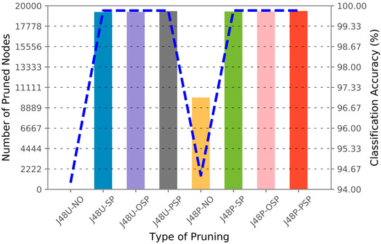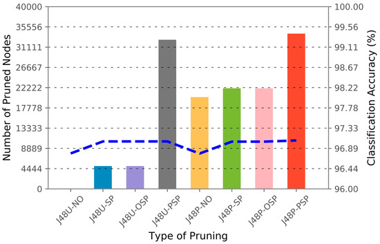 Based on the similar concepts, Wang and Chen [38] proposed a multi-strategy pruning with the use of a performance parameter that is obtainable based on the three metrics: (i) total number of instances for training and testing data, (ii) classification accuracy, and (iii) scale of the tree, which includes the depth and number of leaf nodes. They reported that the algorithm suggested is able to achieve a lower error rate as compared to a standard C4.5 when tested against an Intrusion Detection System dataset, KDD’ 99.