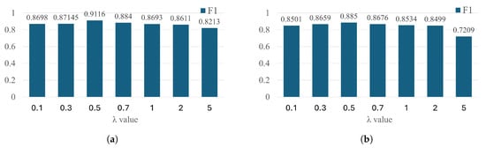 Effect of the adversarial loss parameter on the F1 score; (a) SWaT dataset; (b) SMAP dataset.