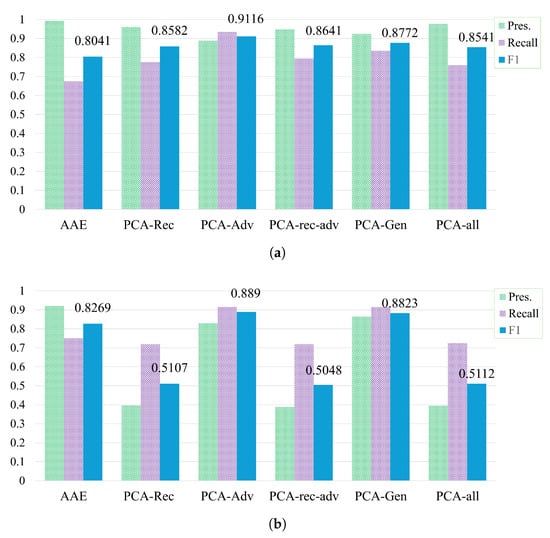 Precision, recall, and F1 score results on the SWaT and SMAP datasets are shown in Figure 3. When applying PCA to the reconstruction network only (PCA-rec-AAE) on the SWaT dataset, it improves recall (0.7759) compared to AAE and strengthens the F1 score (0.8582). This indicates that PCA can enhance the model’s sensitivity to anomalies. However, on the SMAP dataset, this configuration significantly reduces precision (0.396) and leads to a low F1 (0.5107). We also observe that variants involving applying PCA to the reconstruction network, such as PCA-rec-adv-AAE and PCA-All-AAE, either have no noticeable effect on the SWaT dataset or negatively impact performance on the SMAP dataset. This suggests that applying PCA to the reconstruction network may increase false positives in more complex datasets that contains subtler anomalies and diverse entity behaviors.