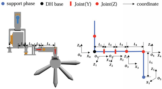 To establish the coordinate systems for Denavit–Hartenberg (D–H) modeling, the following conventions are adopted. The Z-axis is defined as the direction of the axis of joint i + 1 . Although its orientation can be arbitrary, for simplicity, all Z-axes are typically considered parallel, and the direction parallel to the robot’s spine is chosen as the base coordinate direction for consistency. The X-axis is oriented along the common normal between adjacent Z-axes, pointing from one Z-axis to the next. The direction of the base coordinate system is arbitrary but is generally chosen to align with the global coordinate frame. The Y-axis is determined using the right-hand rule, where the thumb points in the Y direction when the fingers curl from the Z-axis to the X-axis. The origin of each coordinate frame is located at the intersection of its corresponding Z-axis and X-axis.