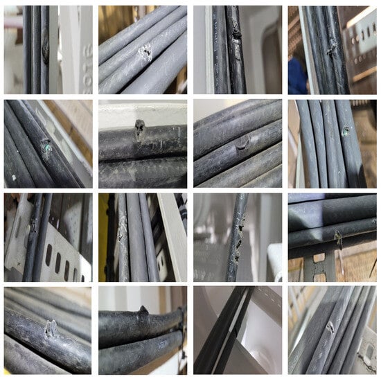 To validate the effectiveness of the robot’s visual recognition module in real-world scenarios, a publicly available cable defect image dataset [37] was employed in this study (as shown in Figure 5). After undergoing image enhancement processing, the dataset comprises over 1500 annotated images, covering a wide range of common cable surface damage types, such as insulation aging, cracks, scratches, and contamination. The images were collected under diverse underground conditions, including varying lighting levels, background clutter, and overlapping cables, to ensure high variability and realism. The dataset is divided into training and validation sets with a ratio of 4:1, ensuring effective model learning and performance evaluation. In addition, a separate test set consisting of 113 unlabeled images is used to assess the model’s generalization in unseen conditions. By encompassing diverse scenarios, the dataset ensures high representativeness and robustness for training and evaluation.
