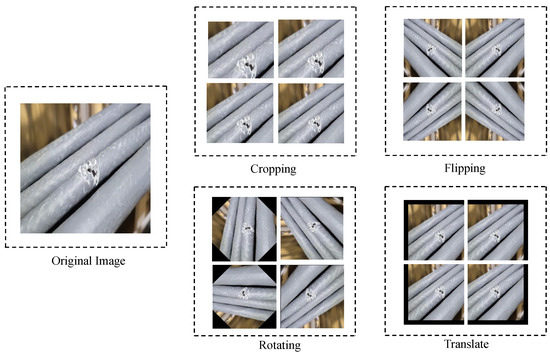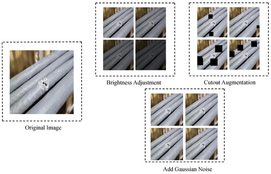 In real-world underground cable inspection environments, image acquisition is often affected by noise interference, uneven lighting, occlusions, and perspective distortions [38], which reduce the clarity and distinguishability of defect areas. To enhance the robustness and generalization ability of detection models under complex conditions, this study implements a series of image augmentation strategies. These methods not only enrich sample diversity but also improve the detection of fine features such as micro-cracks and aged insulation layers.