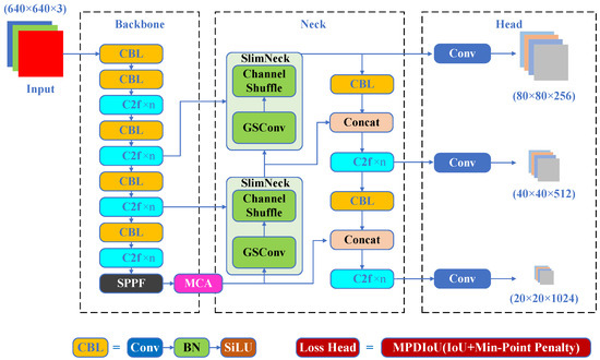 To address the limitations of existing YOLOv8-based detectors in identifying fine-grained cable defects under occlusion and uneven lighting, we introduce a modular enhancement strategy composed of three core components: SlimNeck, MCA, and MPDIoU. The SlimNeck module, designed to improve feature aggregation efficiency, integrates GSConv and VoV-GSCSP blocks to build a lightweight neck architecture. This design improves model compactness and ensures faster inference, making it suitable for real-time deployment on edge devices. The MCA module applies coordinate attention along the channel, width, and height dimensions, enhancing the model’s ability to focus on defect-relevant regions in complex visual scenarios. This helps to boost the discriminative power of extracted features, especially for small-scale or subtle cable defects. The MPDIoU loss function introduces a geometric penalty based on the minimum point-to-point distance between predicted and ground-truth bounding boxes. This refinement addresses limitations of standard IoU-based metrics, improving the localization accuracy for fine-grained defect boundaries. These components are designed to work together to improve feature fusion, spatial attention, and localization accuracy while maintaining real-time performance.