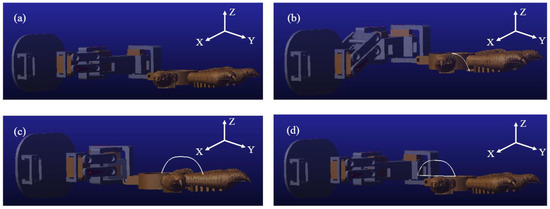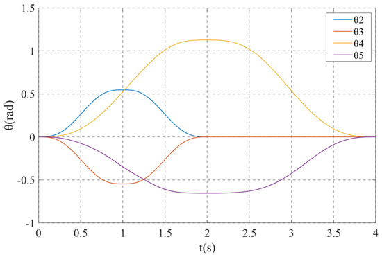 Figure 14 illustrates the joint angle variations in a complete motion cycle. It can be observed that the motion of each joint exhibits continuous and smooth trends, satisfying the kinematic requirements of the zero-impact trajectory.