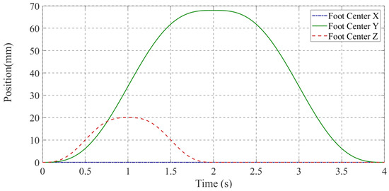As shown in Figure 13, the motion trajectory of the foot end in the X, Y, and Z directions is presented. The position in the X direction remains constant throughout the cycle, forming a straight line that aligns with the expected plan. In the Y-direction, the foot-end position increases from 0 mm to 68 mm during the first half of the cycle (0–2 s), then returns from 68 mm to 0 mm during the second half (2–4 s). The total range of motion is 68 mm , which matches the stride length S. In the Z-direction, the foot-end position changes from 0 mm to 20 mm during the first quarter of the cycle (0–1 s), returns to 0 mm in the second quarter (1–2 s), and remains constant during the remaining half. The peak-to-valley distance of 20 mm matches the leg lift height H.