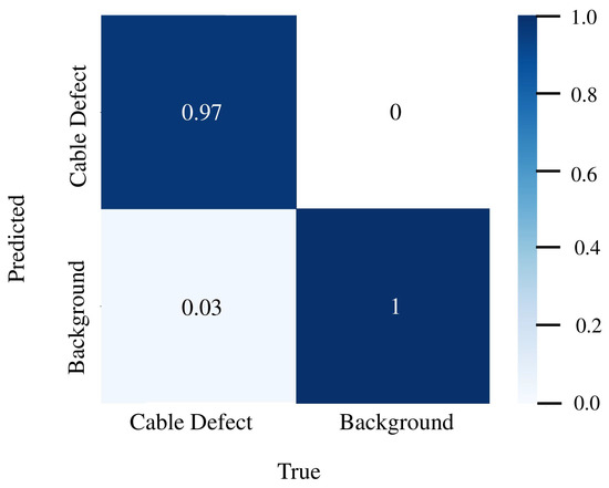 According to the figure, the model correctly identifies 97% of actual defects ( T P = 0.97 ) and all background instances ( T N = 1.00 ), with no false positives ( F P = 0.00 ) and only a 3% false negative rate ( F N = 0.03 ). These results indicate that the model achieves high accuracy and strong robustness in distinguishing cable defects from the background. The nearly perfect classification performance demonstrates the model’s reliability and effectiveness in defect detection, offering valuable guidance for further optimization and practical deployment capability.