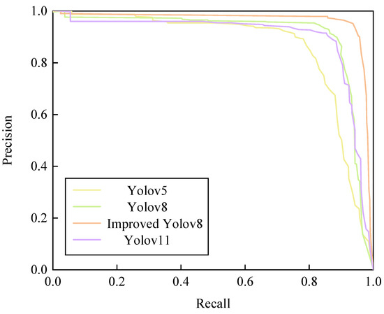 The P–R curve provides an intuitive representation of the trade-off between precision and recall under different confidence thresholds by comparing YOLOv5, YOLOv8, YOLOv11, and the improved YOLOv8, as illustrated in Figure 17. It effectively highlights the overall effectiveness and performance differences of each model in multi-category defect identification tasks.