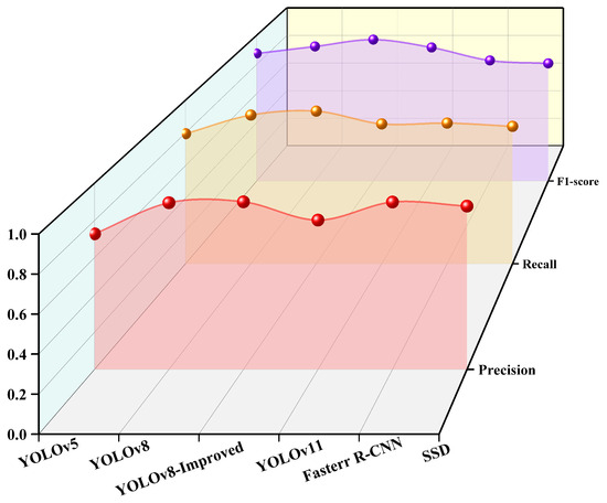 Figure 19 presents the performance comparison of four object detection models for cable defect detection. Among them, YOLOv5 shows comparatively lower performance across all the evaluated metrics, implying a higher tendency for false positives and false negatives. The original YOLOv8 demonstrates marked improvements in both precision and recall, resulting in better overall detection accuracy. The improved YOLOv8 model further enhances this performance, achieving superior balance and robustness. In contrast, YOLOv11 maintains relatively high recall but shows a decline in precision and overall F 1 -score, indicating potential weaknesses in suppressing false detections. Overall, the improved YOLOv8 outperforms the other models in terms of comprehensive detection capability.