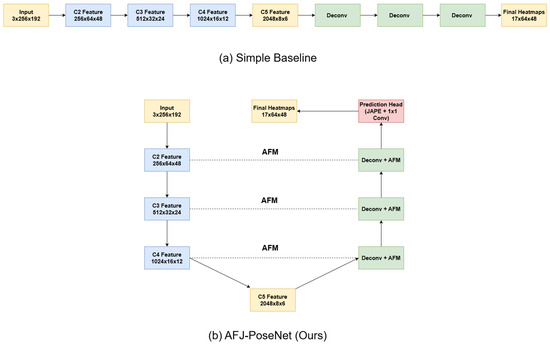 Our work is built upon the Simple Baseline proposed by Xiao et al. [2]. Its standard configuration consists of a ResNet encoder and a simple decoder composed of three transposed convolution layers. The central problem is the information gap between the decoder and encoder. To overcome this, we propose AFJ-PoseNet. The overall architectural comparison is shown in Figure 1.