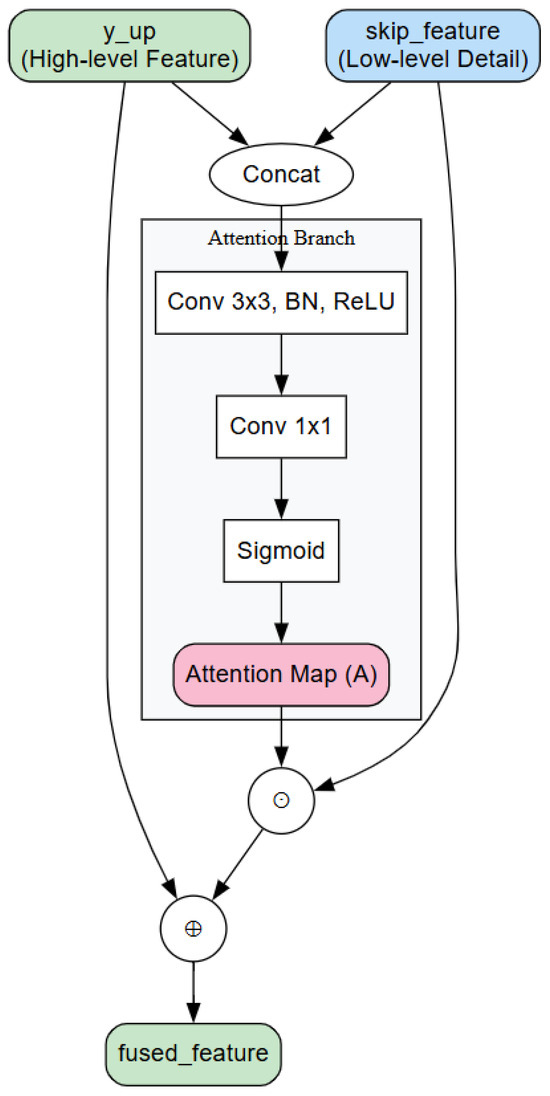 This generated attention map A is then used to modulate the original skip_feature via element-wise multiplication. The result is added to the upsampled feature y_up through a residual connection to produce the final fused feature. This fusion step is described by