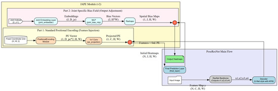 A fundamental limitation of standard CNNs is their inherent translation invariance. While advantageous for image classification, this property is suboptimal for localization-sensitive tasks like HPE, which require understanding not only what a feature is but also where it is located in the image. Furthermore, standard models lack explicit knowledge of the human body’s anatomical structure, such as the statistical likelihood that a “head” appears in the upper part of an image. To address this dual challenge of spatial ambiguity and lack of structural priors, we propose the Joint-Aware Positional Encoding (JAPE) module.