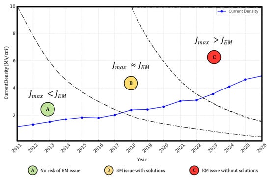 As illustrated in Figure 1, the ITRS projected a continued increase in current density within IC interconnects, reaching magnitudes on the order of 106 A/cm2 [14]. According to the ITRS projections, EM-induced reliability concerns become significant when the current density approaches Jmax (region B in the figure). Furthermore, once the current density surpasses JEM (region C in the figure), the ITRS indicates that no existing process or design mitigations are sufficient to prevent EM-related failures. Compounding this challenge, the ITRS also warned that—even with a constant current density—the average lifetime of interconnects would be halved with each successive technology node generation due to ongoing reliability degradation caused by EM [14].
