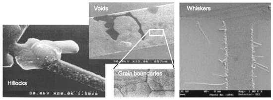 SEM images of EM-induced failure modes: hillocks, voids along grain boundaries, and whisker growth. Reproduced with permission from Bernstein, G.H. & Frankovic, R., in Ref. [25]. Copyright 2025, Springer Nature.