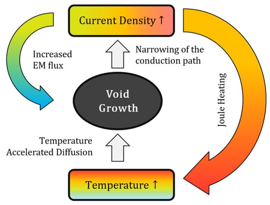 It is important to note that the interplay between current density and temperature can lead to a thermal positive feedback acceleration effect. Specifically, the passage of current through interconnects generates Joule heating, and the resulting temperature rise accelerates atomic diffusion within the EM process. This, in turn, promotes rapid void growth, reducing the conductor’s cross-sectional area. The reduction further increases the local current density, which generates additional Joule heating. As illustrated in Figure 4, this entire process forms a positive feedback loop: EM induces void formation → reduction in conductor cross-sectional area → increase in local current density → increased Joule heating → elevated temperature → accelerated EM-induced failure → further void growth [41]. This feedback loop significantly exacerbates EM degradation in ICs. Consequently, thermal coupling analysis—particularly simulations and analyses assessing the impact of self-heating on EM failure probability—has become a critical consideration in modern chip design [42].