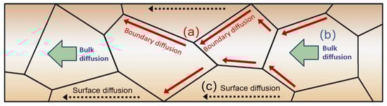 Metal atom diffusion—a critical aspect of EM—primarily occurs through three mechanisms, as illustrated in Figure 5: bulk diffusion (through the crystal lattice), grain-boundary diffusion (along grain boundaries), and surface diffusion (along the metal surface) [25,51,52]. The relative importance of each mechanism depends on factors such as temperature, material properties, and the microstructure of the interconnect.