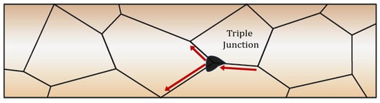 Based on these activation energy hierarchies, EM tends to occur preferentially along interconnected grain boundaries and metal surfaces. The process of atomic migration at grain boundaries, ultimately leading to void formation, is well described by the triple junction model [56]. As illustrated in Figure 6, a triple junction is typically located at the intersection of three grain boundaries. Driven by the electron wind, if metal atoms flow into the junction through one grain boundary but flow out through the other two, a net outflow results. This leads to mass depletion and the formation of a void at the junction. Conversely, if atoms flow into the junction from two grain boundaries and out through the third, mass accumulation occurs, resulting in the formation of a hillock.
