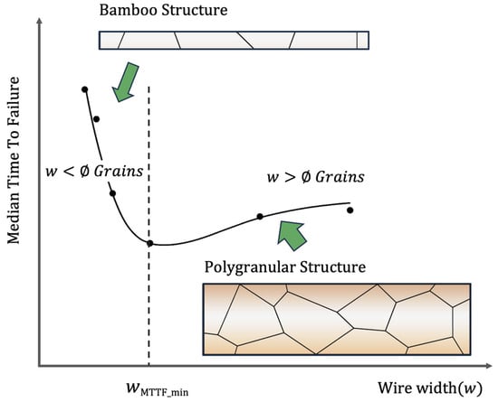 Therefore, reducing the number of triple junctions in interconnects is an effective strategy for improving EM lifetime [34,78,79,80]. For instance, as process technology scales down the wire width, when the width approaches the size of a single grain, most interconnected grain boundaries are truncated and eliminated, leading to the effective elimination of triple junctions. Consequently, the EM resistance of the interconnect can be significantly enhanced. The resulting metal microstructure, resembling a bamboo stalk lacking triple grain boundary intersections, is referred to as a “bamboo structure,” as illustrated in Figure 7.