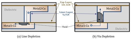 Line Depletion: When electrons flow from a vertical via into a metal line on another layer, the EM effect causes Cu atoms to diffuse in the direction of electron flow. However, the diffusion barrier layer prevents Cu atoms at the via from diffusing into the lower interconnect, inhibiting atomic replenishment at the via-to-line junction. As diffusion progresses, a void eventually forms at this location, leading to increased line resistance and, potentially, an open-circuit failure.