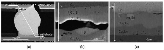 Cross-sectional SEM images of a SnAgCu solder joint after EM testing. (a) Overview showing current flow from chip side (cathode) to substrate side (anode); (b) cathode region with void formation at the Cu6Sn5/Ag3Sn/Sn interface; (c) anode region with thickened IMC layers but no voids. Reprinted with permission from [93]. Copyright 2020, Elsevier.