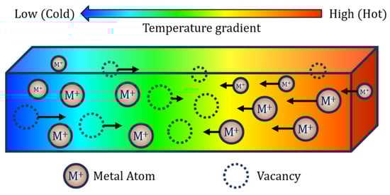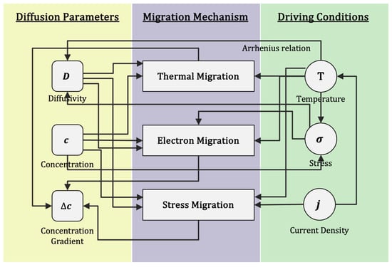 In the EM failure process, the electron wind force is not the sole driving mechanism; it often coexists with other migration phenomena such as TM, SM, and chemical migration [115,116]. Environmental or Joule heating from high current densities can induce a temperature gradient, driving metal atoms to diffuse from high-temperature to low-temperature regions. EM also causes material redistribution within metal lines, resulting in stress gradients (as discussed in Section 3.8). Combined with thermal expansion mismatches at elevated temperatures and residual stress from fabrication, these factors drive atom migration via stress-induced diffusion. Additionally, these migration processes lead to non-uniform atomic concentration distributions within the metal structure, forming concentration gradients that can induce further diffusion, a process known as chemical migration.