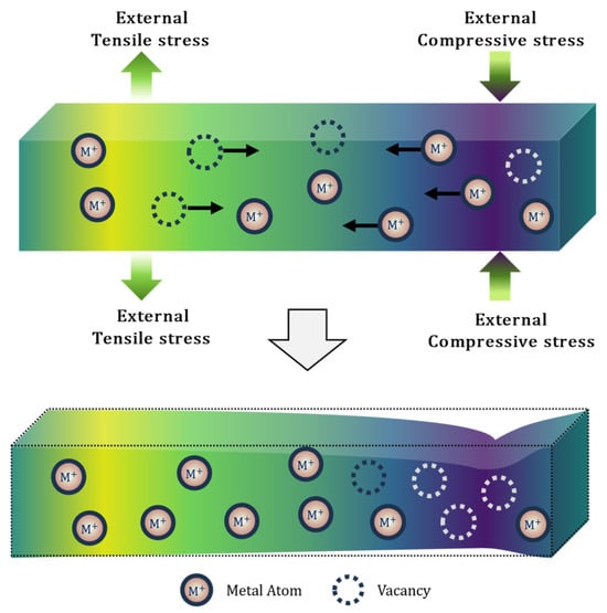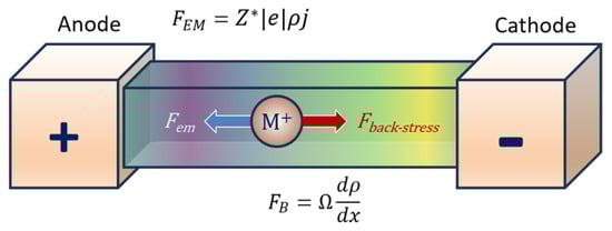 EM causes the redistribution of metal atoms and vacancies within interconnects, with atoms migrating toward the anode and vacancies accumulating near the cathode. Because vacancies occupy less volume in the crystal lattice than metal atoms, atom removal from the cathode region leads to lattice relaxation and volumetric contraction of the interconnect [110]. Conversely, atom accumulation at the anode causes volumetric expansion. Due to mechanical constraints from the surrounding dielectric material, this volume change is not fully accommodated, resulting in tensile stress at the cathode and compressive stress at the anode. Various studies have proposed methods for analyzing stress evolution in interconnects during EM [111,112,113,114]. In Section 4, we will further explore the interplay between stress gradients and electron wind forces and their combined effect on EM-induced failure.