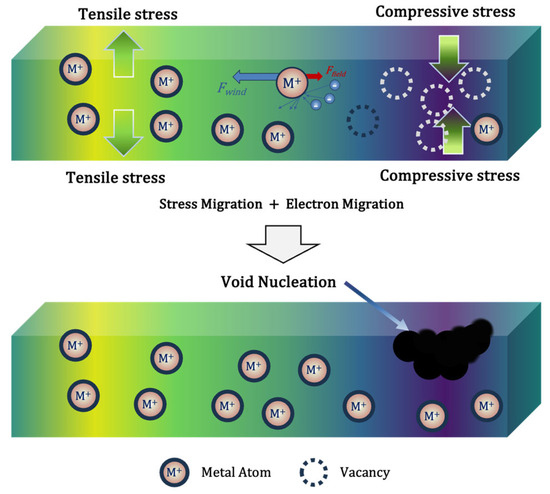 EM is a phenomenon where metal atoms in conductors move due to the transfer of momentum from flowing electrons [1,2]. EM causes metal atoms to move in the direction opposite to the electric field, leading to material diffusion and loss in metal conductors, which is a major reliability issue for electronic equipment [2]. While the fundamental mechanism involves momentum exchange, the practical consequence is the gradual displacement of metal ions, leading to material redistribution and potential failure in electronic components, particularly the miniaturized interconnect lines of integrated circuits (ICs) [3]. The dominant diffusion mechanism varies depending on the material and operating conditions; in bulk materials at elevated temperatures, lattice diffusion predominates, while in thin films, grain boundary diffusion becomes the primary pathway at lower temperatures and higher current densities [1]. Electromigration (EM)-induced failure modes primarily include the formation of voids (material depletion), hillocks (material accumulation), whiskers, and intermetallic phases under prolonged current stressing [4]. Void nucleation, growth, motion, and shape change all play crucial roles in the failure mechanism [3,5]. Predictive modeling of EM-induced void formation is critical for enhancing reliability in scaled ICs [6]. The spatiotemporal evolution characteristics—including void morphology development and positional migration—fundamentally determine interconnect failure rates, performance degradation, and nanostructure integrity in advanced metallization systems [7]. This void nucleation process predominantly results from hydrostatic stress gradients inducing localized mechanical degradation in conductor lines [8]. EM-induced void formation and growth in metal interconnects is a critical failure mechanism in microelectronics and can be influenced by a wide range of factors, including film purity, crystallographic orientation, grain size distribution, the presence of a passivating overcoat (e.g., glass), and the addition of solute atoms [1,9]. As IC dimensions continue to shrink and current densities increase, traditional mitigation strategies, such as simply increasing interconnect wire width, become impractical. This necessitates the development and implementation of innovative materials, design techniques, and process optimizations to effectively mitigate EM effects and ensure long-term reliability in advanced microelectronic devices [2].