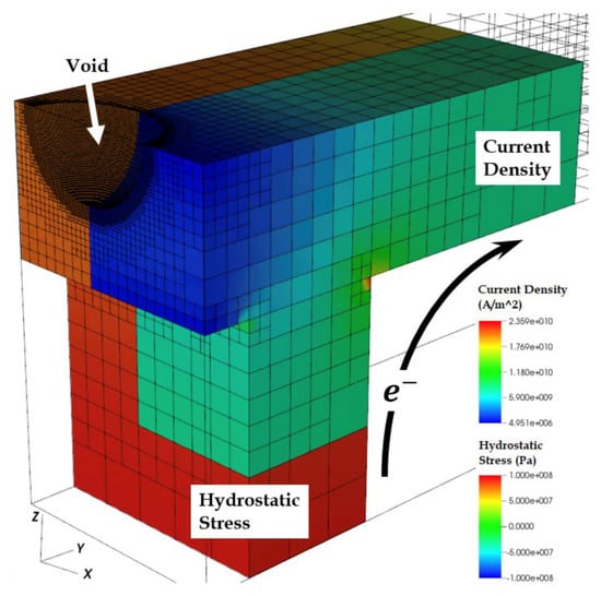 - Hua, Y.; Basaran, C.; Hopkins, D.C. Numerical simulation of stress evolution during electromigration in IC interconnect lines. IEEE Trans. Compon. Packag. Technol. 2003, 26, 673–681. [Google Scholar] [CrossRef]