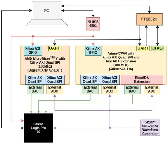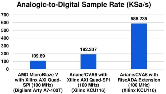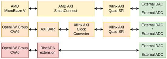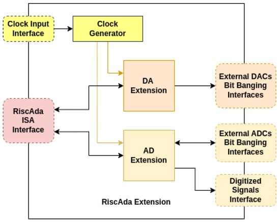 The main contributions of this paper are: the open-source RISC-V extension for optimized control of parametrizable numbers of external DACs and ADCs distributed together with a CV-X-IF ([]) adapter designed for integration as a coprocessor beside ([]), a GNU/GCC-compatible C library for using the extension without modifying the compiler and the experiments proving the performance improvements gained by using dedicated hardware accelerators instead of classical memory-mapped peripherals. The RiscADA extension HDL files and the dedicated C library files are available in the kcu116 branch of the CVA6 repository fork at https://github.com/cosminandreipopovici/cva6/tree/kcu116 (accessed on 1 July 2025).