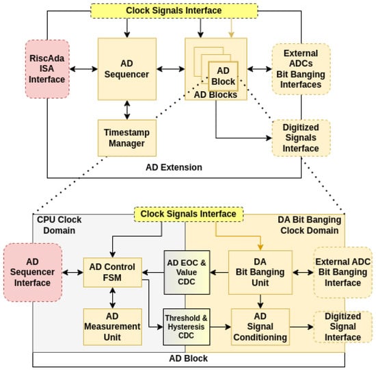 - AD Extension is the sub-extension of RiscADA Extension used for reading the external ADCs and for computing basic statistics on the sampled signals and includes a parametrized number of AD Blocks; it is also responsible for the digital signal conditioning of the analog inputs; in this context, digital signal conditioning refers to reading an analog input, comparing its value to a preconfigured threshold and setting an digital output to logic ‘1’ if the value exceeds the threshold (plus a hysteresis value) or to logic ‘0’ if the value drops under the threshold (minus the hysteresis value).